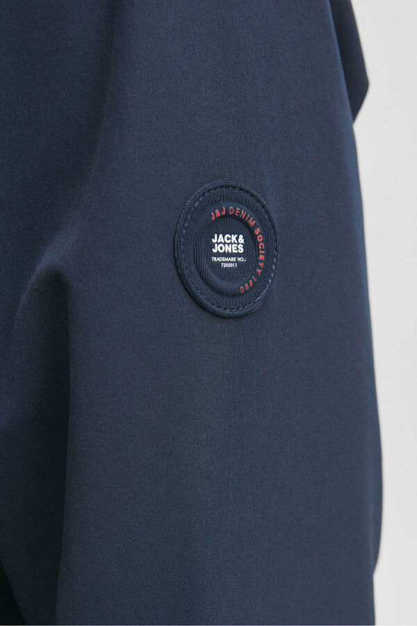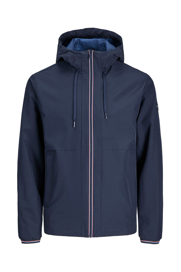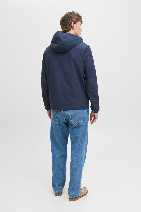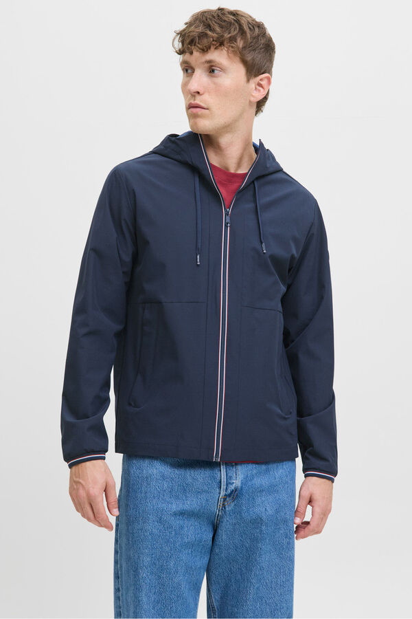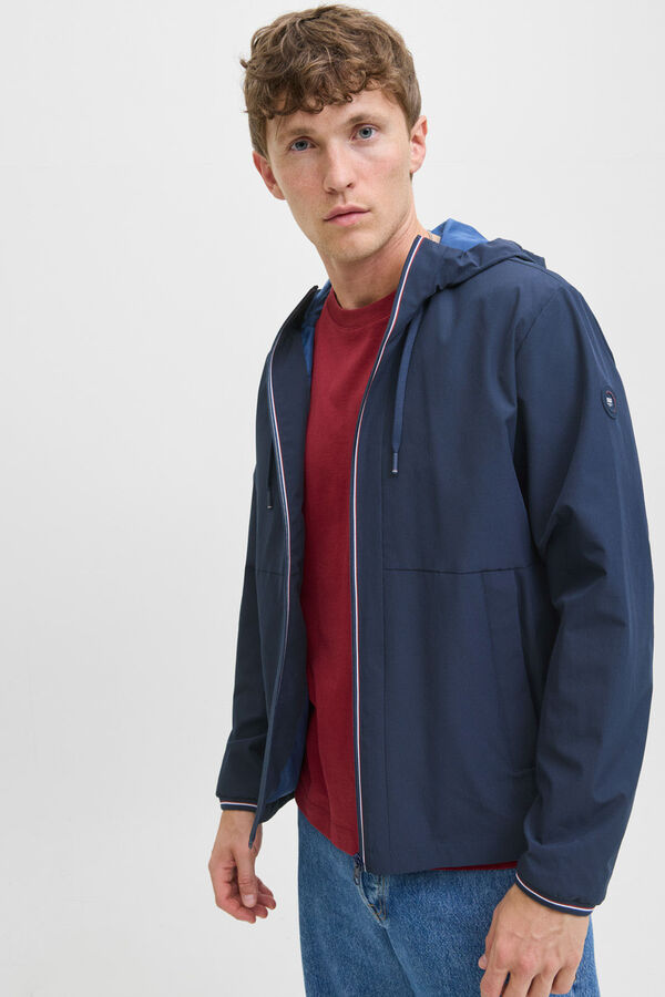 Casaco leve, estilo corta-vento, para meia-estação, com capuz e manga compridas. Punhos elásticos, interior forro e fecho de fecho-éclair.