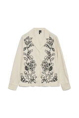Camisa de linho de manga comprida com gola de lapela. Fechamento frontal com botões e estampado com efeito bordado.