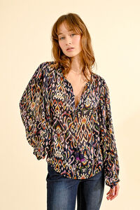 Camisa fluida e estampada, com gola de lapela e manga comprida. Fechamento frontal com botões e detalhe de botões nos punhos.