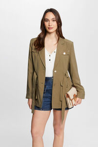 Jaqueta de manga comprida com bolsos, gola de lapela, tecido macio e estampado liso.