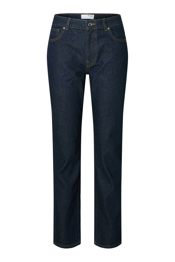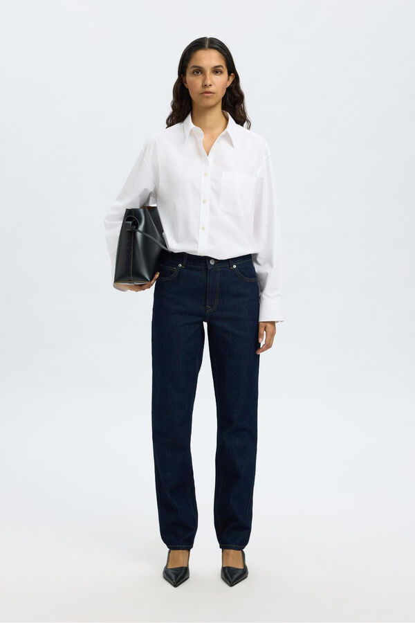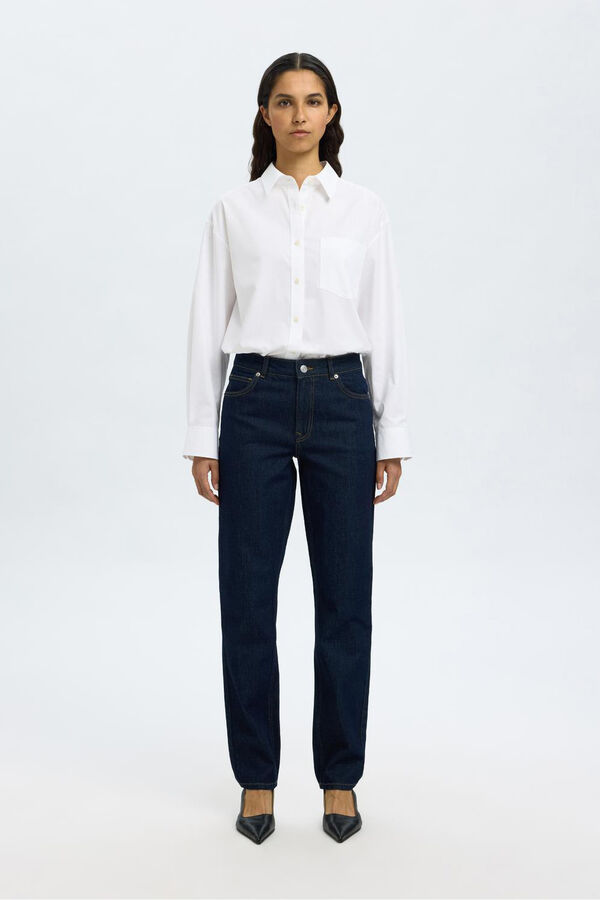 Calça slim fit confeccionada em algodão orgânico. Cintura alta. Fechamento por fecho-éclair e botão. Bolsos frontais e traseiros.