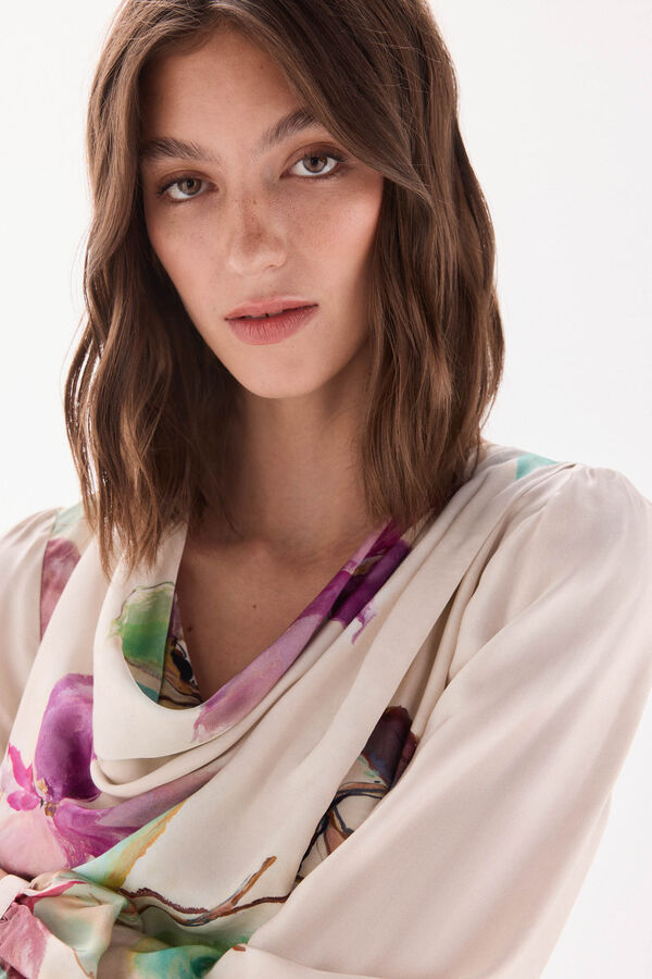 - Estampa posicionada no corpo, baixo das mangas e parte superior da saia