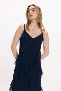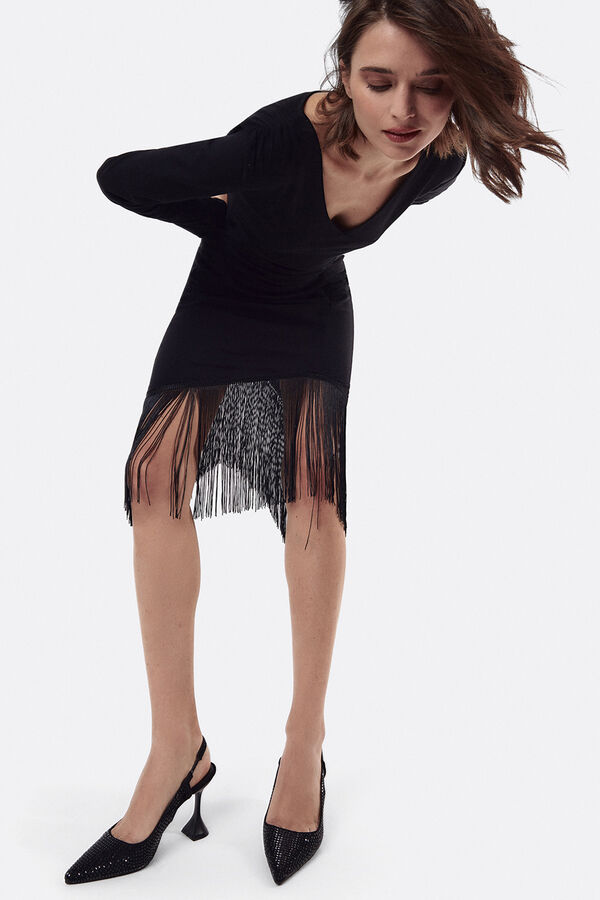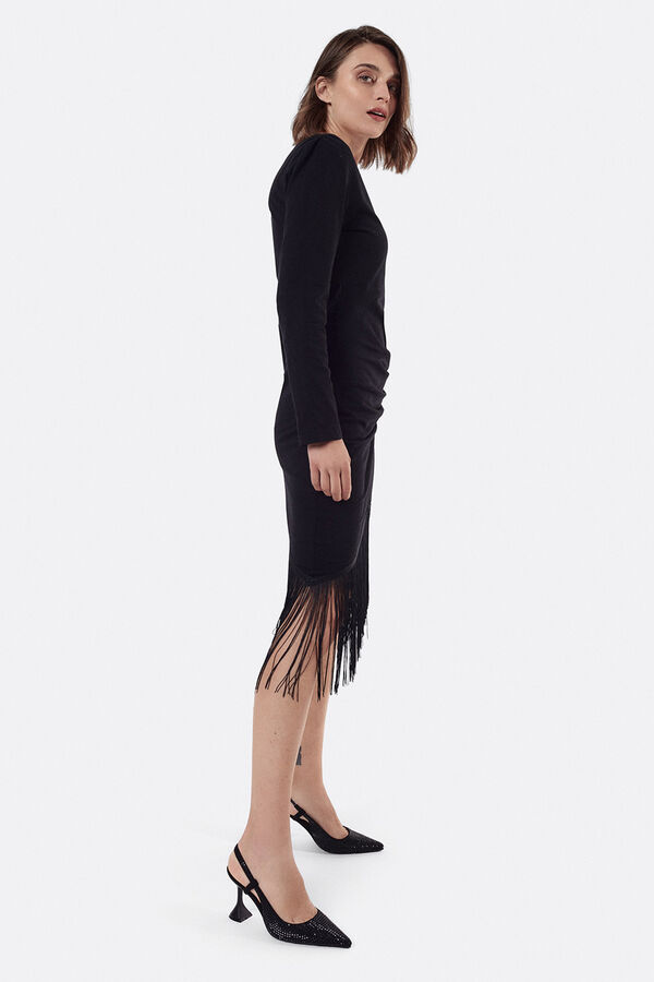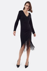 Vestido preto ousado de manga compridas com franjas longas na barra. Este vestido vestido e elegante pode ser combinado com acessórios e calçado chamativos.