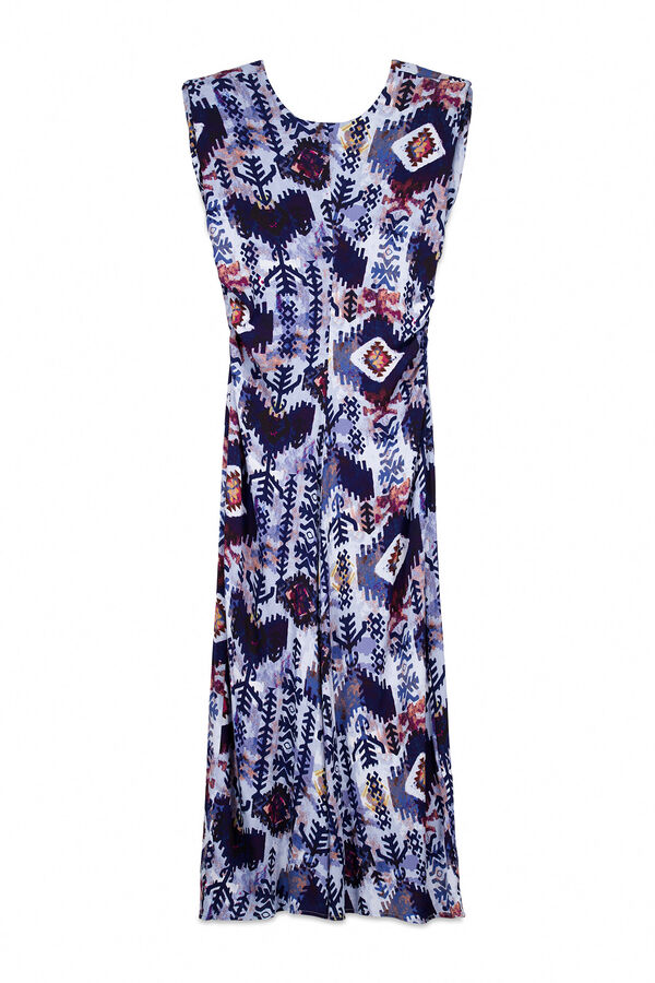 -Vestido estampado. - Gola caixa. -Sem mangas com ombreiras. -Detalhe drapeado nas laterais. -Fecho nas costas com fecho-éclair invisível. - Contém fibras recicladas.