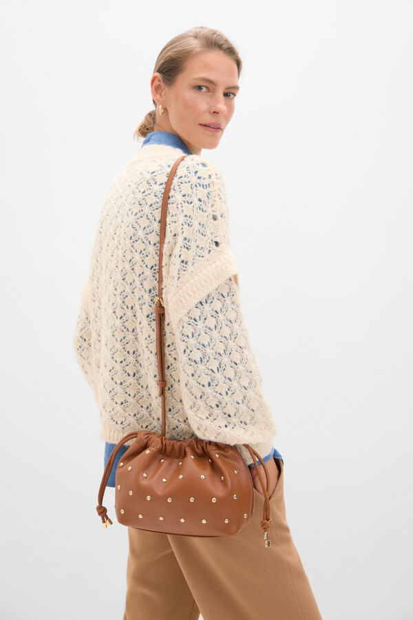 -Bolso tipo saco, con el cuerpo adornado con tachas y fruncido mediante asas laterales que funcionan como cierre.