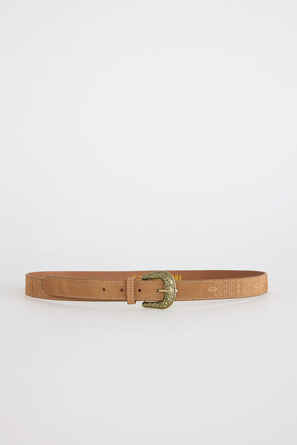 Pespunte a contraste en forma de motivos y la palabra SLOWLOVE - Hebilla en metal dorado - Medidas: 2'8cm