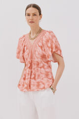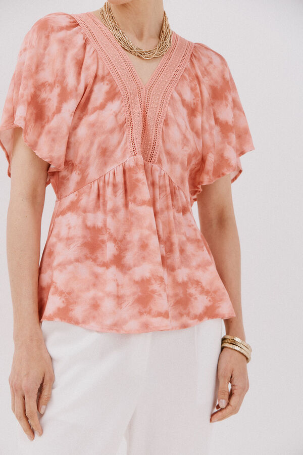 - decote estampada com bico e detalhe de renda - Mangas largas e fluidas com folho- Caimento solto com caimento suave